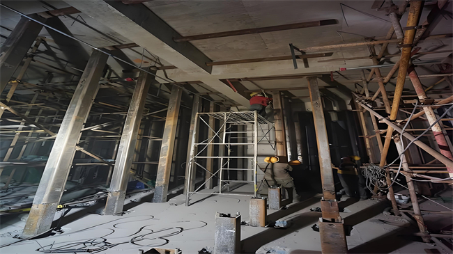 支撐系統(tǒng)一般采用組合鋼管支撐,通過(guò)鋼管與鋼板形成剛性連接,并在組合鋼管下端設(shè)置螺旋千斤頂。通過(guò)千斤頂?shù)捻斏鸩綄⒘褐系暮奢d轉(zhuǎn)移至支撐系統(tǒng),從而實(shí)現(xiàn)梁柱的卸載。在卸載過(guò)程中,需要特別注意荷載的均勻分布,避免對(duì)周圍結(jié)構(gòu)產(chǎn)生不利影響。
